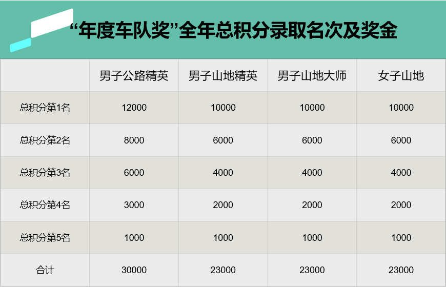 (三)本站前八名将获得:10、8、6、5、4、3、2、1的年度积分,全年总积分排名前5名的车队,颁发奖金、奖杯及荣誉证书,6至8名颁发奖杯、荣誉证书。具体奖金如下:总金额:99000元(人民币)。