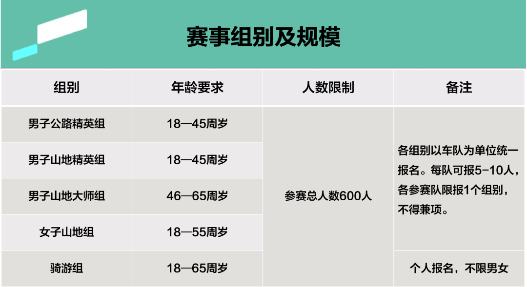 4.比赛出发:比赛出发方式为分组集体出发,出发顺序:男子公路精英组、男子山地精英组、男子山地大师组、女子山地组、骑游组;每个组别选手出发顺序以该组别选手检录顺序排定出发顺序。