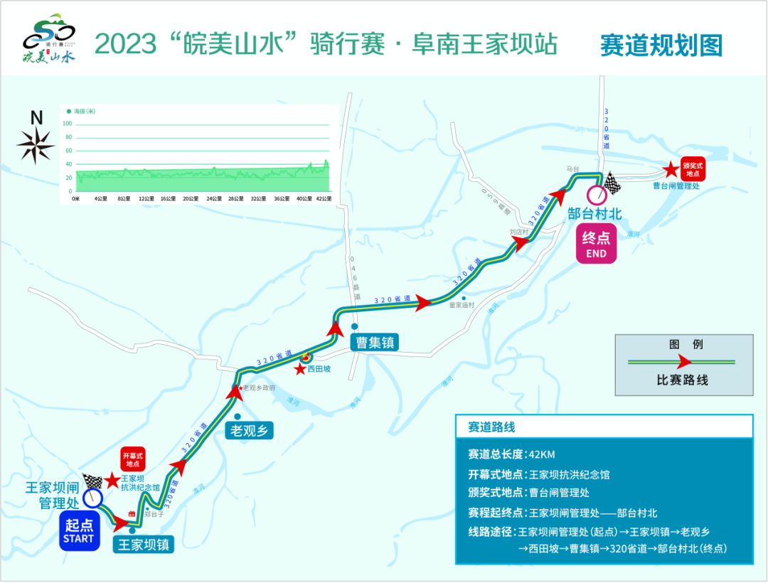 1.车队组:总长42公里。王家坝闸管理处[起点] —王家坝镇—老观乡—西田坡—曹集镇—320省道—郜台村北[终点]