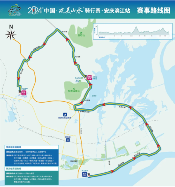 1、竞赛组:滨江夜市(起点)→沿江东路→滨江大道→联兴路→外环北路→石塘湖→347国道→石树山景区→S462→五横环乡路→X023→稼先大道→龙城路→邓石如路→安庆市宜秀区人民政府广场(终点)。赛道总长度约54公里。