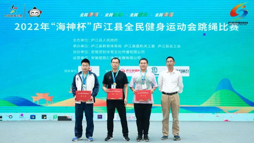 经过激烈比拼,县教体局朱灿中夺得本次比赛男子一分钟单摇跳项目冠军,同时他也成为本届庐江县全民健身运动会首金得主,县司法局马南兴、柯坦镇戚瑶瑶分别获得二、三名;女子一分钟单摇跳项目冠军由博安驾校钱珊珊夺得,博安驾校徐花香、县农业农村局刘娇娇分别获得二、三名;